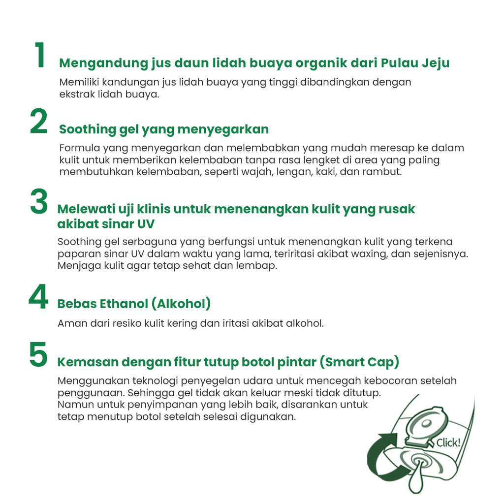 Soothing jel versi baru yang mengandung 99% lidah buaya Jeju ORGANIK yang di jus bukan di ekstrak dari hasil fermentasi sehingga dapat memberikan hasil yang lebih maksimal.